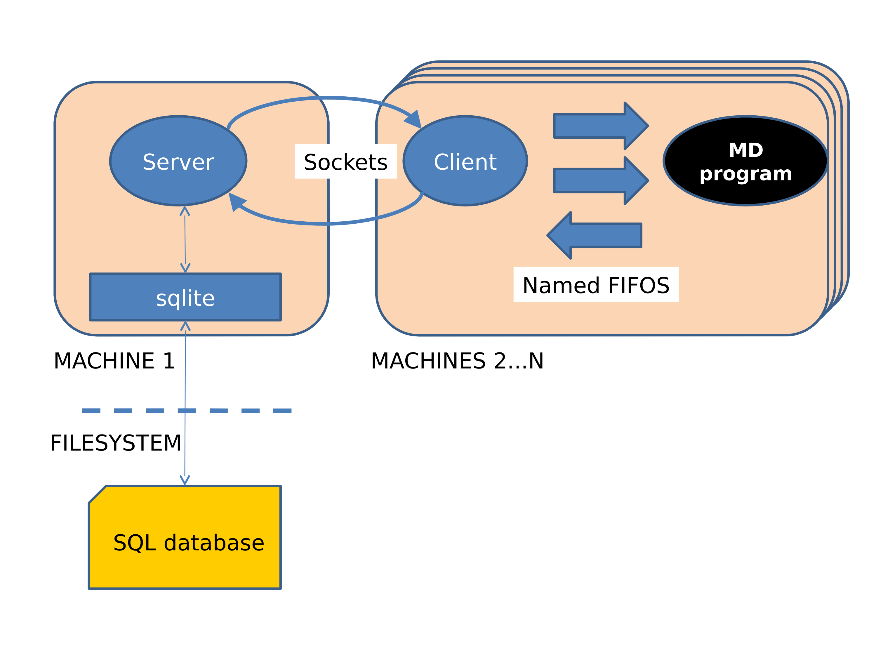 <box left blue|></box|Figure 1: The structure of the FRESHS system. Clients can be on the same machine as the server or on different machines. Each client instance communicates with its own instance of the MD simulation program, run as a “subprocess”. The simulation program can itself be parallel.>