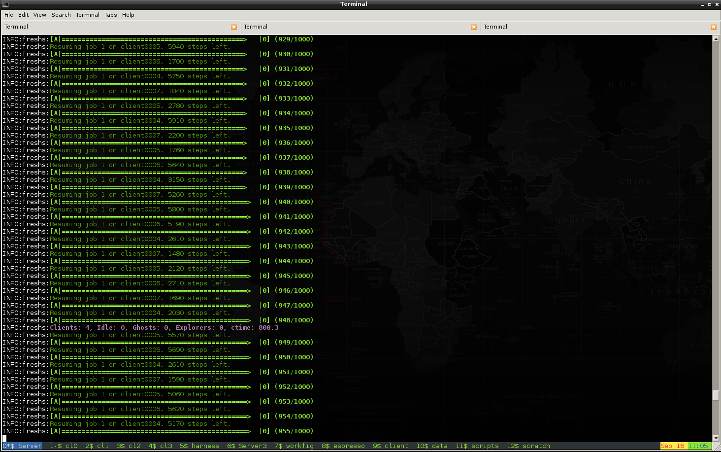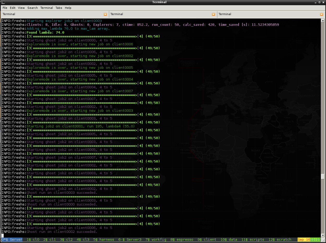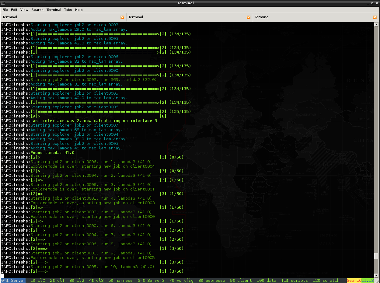 This shows how multiple clients calculate the initial run of an FFS simulation in parallel, resuming their runs after delivering a configuration point to the server. Thereby, the length of a trace is preset in the server's configuration file.